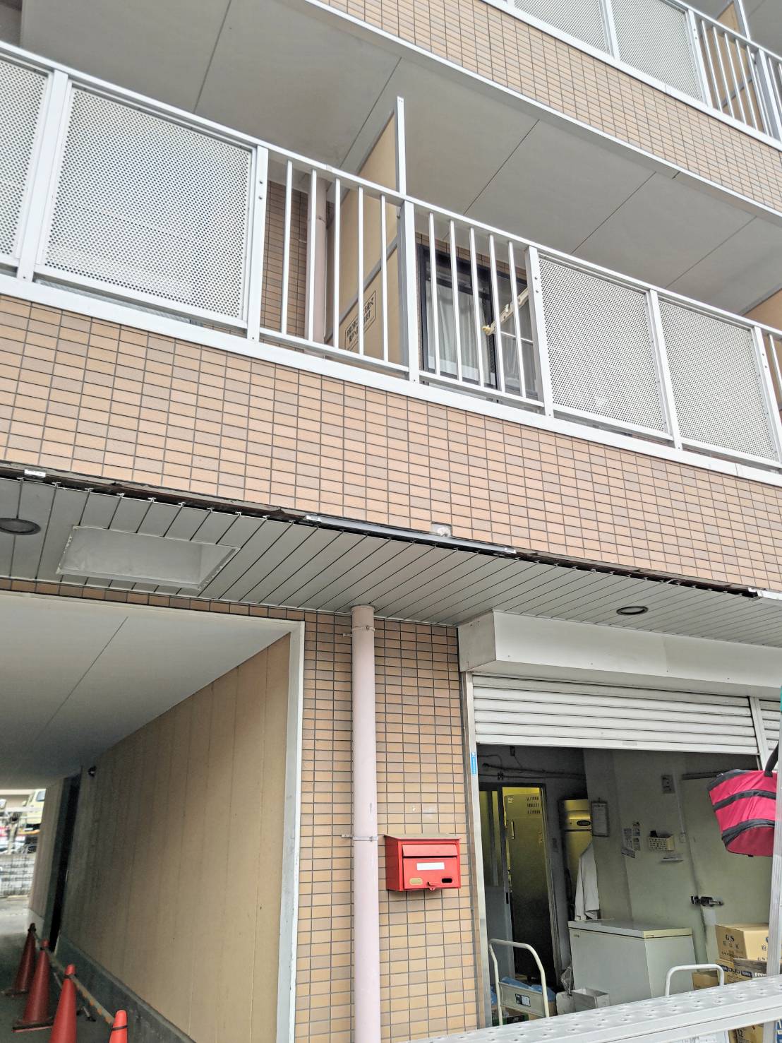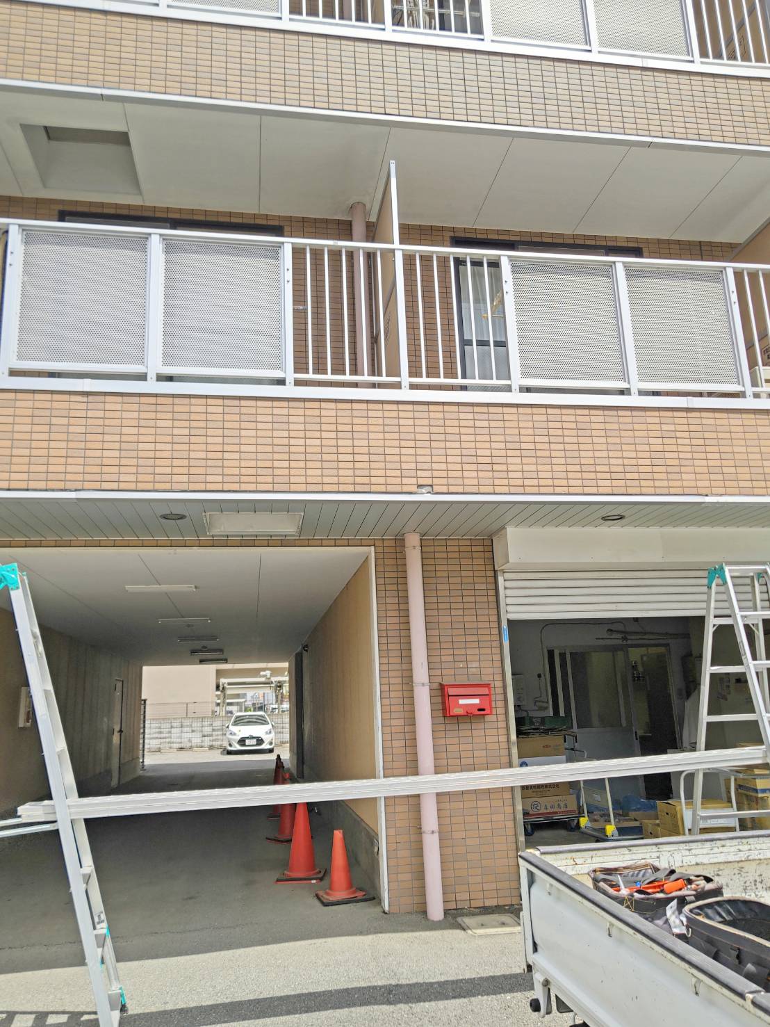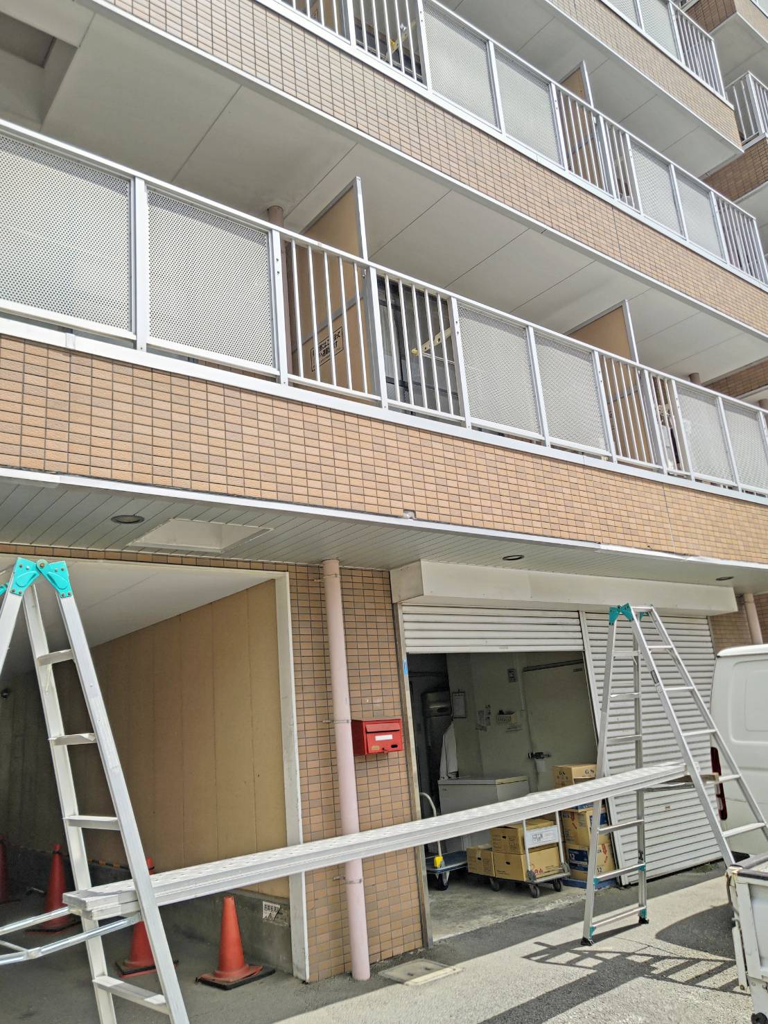 吉永板金工作所では、東大阪市のマンションにおいて、駐車場入口上のオーバーハング水切りの修理工事を行いました。